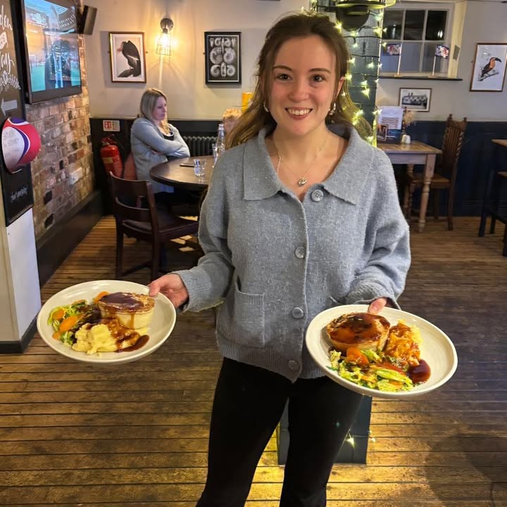 Here is White Horse owner Amy showing off our steak pie and mushroom pie served tonight for our wonderful guests.